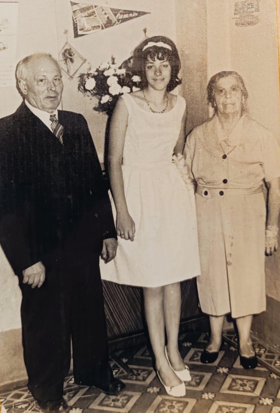 Graciela (primeira neta de José) na festa dos 15 anos, cos seus avós José e Dolores